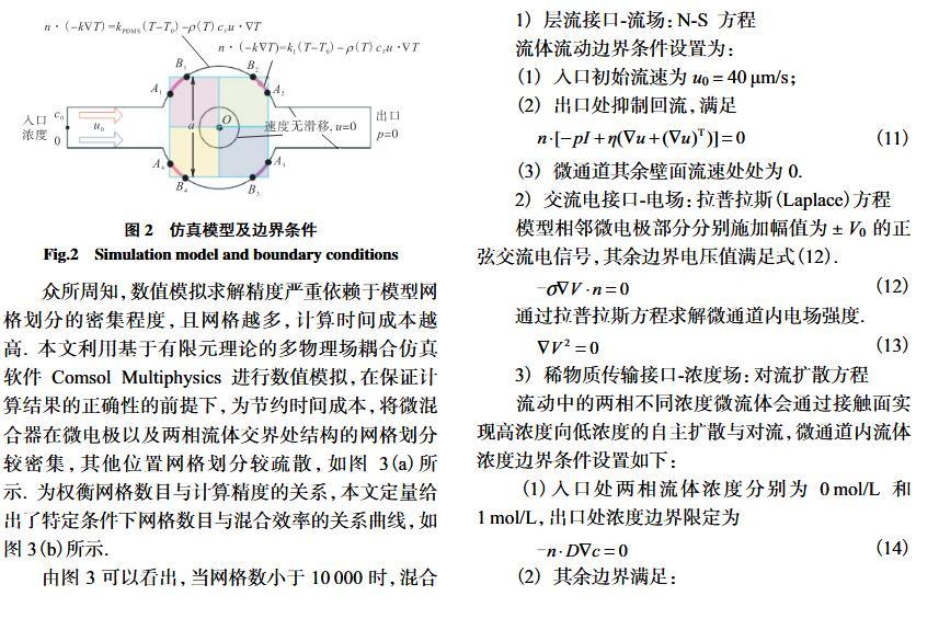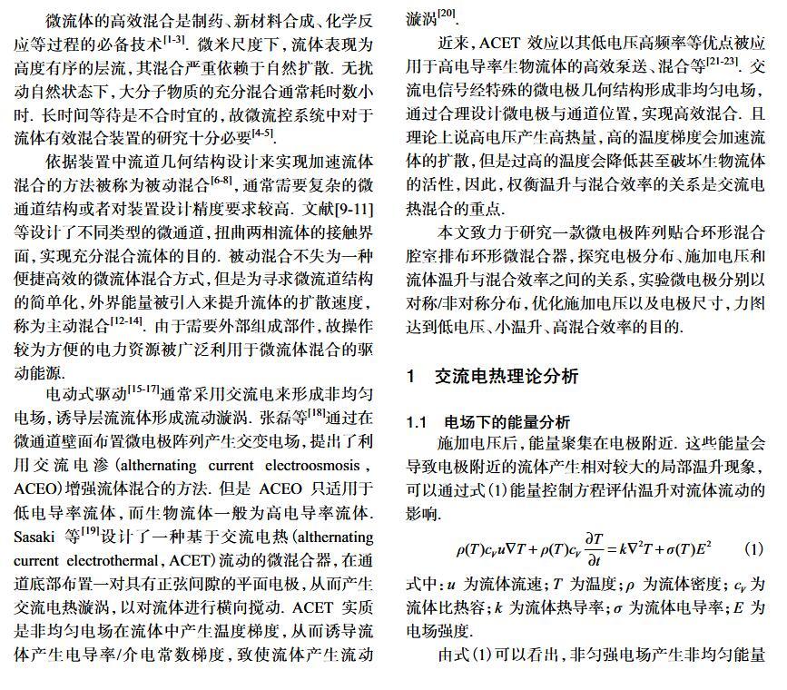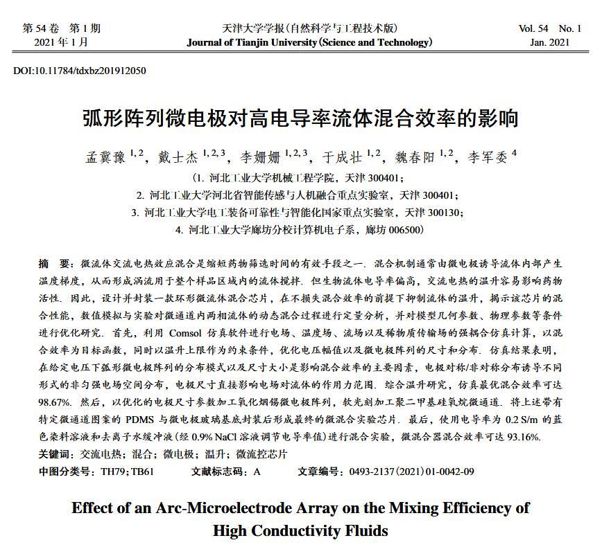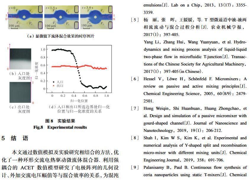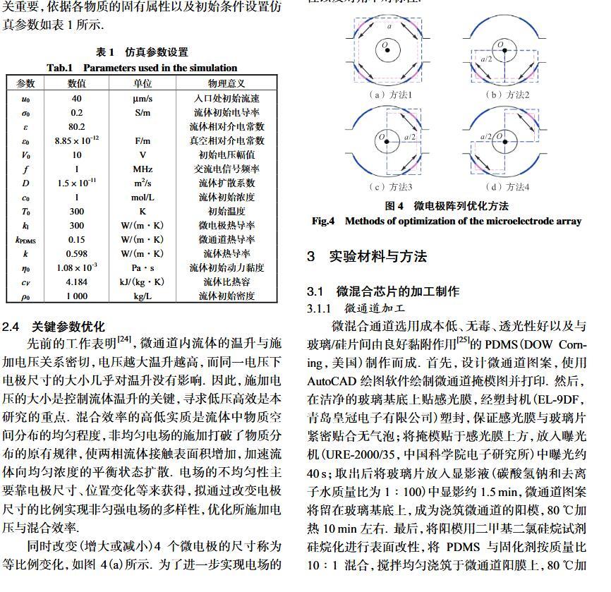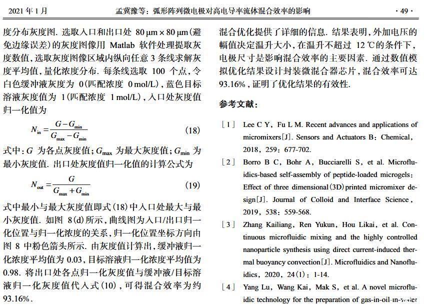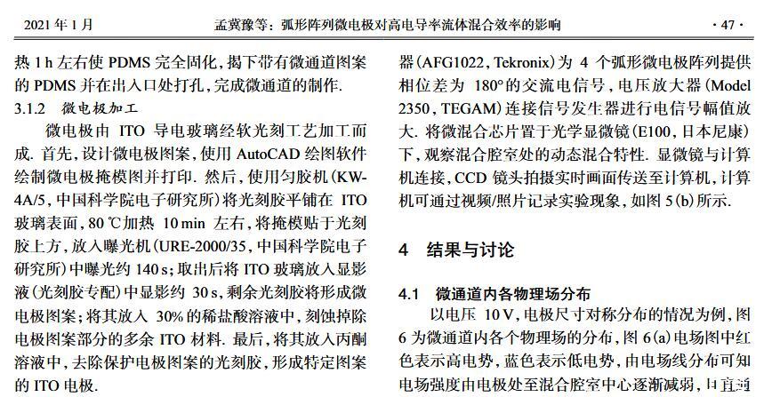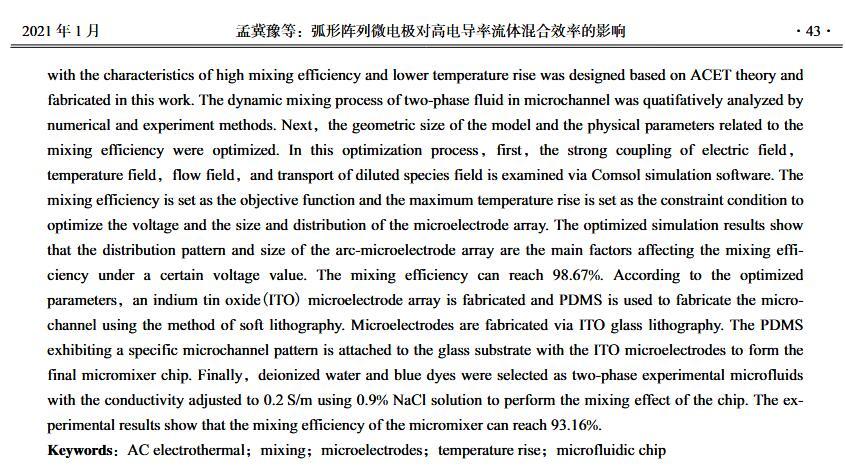 【摘要】:微流體交流電熱效應混合是縮短藥物篩選時間的有效手段之一。混合機制通常由微電極誘導流體內部產生溫度梯度,從而形成渦流用于整個樣品區域內的流體攪拌.但生物流體電導率偏高,交流電熱的溫升容易影響藥物活性。因此,設計并封裝一款環形微流體混合芯片,在不損失混合效率的前提下抑制流體的溫升,揭示該芯片的混合性能,數值模擬與實驗對微通道內兩相流體的動態混合過程進行定量分析,并對模型幾何參數、物理參數等條件進行優化研究.首先,利用Comsol仿真軟件進行電場、溫度場、流場以及稀物質傳輸場的強耦合仿真計算,以混合效率為目標函數,同時以溫升上限作為約束條件,優化電壓幅值以及微電極陣列的尺寸和分布。仿真結果表明,在給定電壓下弧形微電極陣列的分布模式以及尺寸大小是影響混合效率的主要因素,電極對稱/非對稱分布誘導不同形式的非勻強電場空間分布,電極尺寸直接影響電場對流體的作用力范圍。綜合溫升研究,仿真最優混合效率可達98.67%。然后,以優化的電極尺寸參數加工氧化煙錫微電極陣列,軟光刻加工聚二甲基硅氧烷微通道。將上述帶有特定微通道圖案的PDMS與微電極玻璃基底封裝后形成最終的微混合實驗芯片。最后,使用電導率為0.2 S/m的藍色染料溶液和去離子水緩沖液(經0.9%NaCl溶液調節電導率值)進行混合實驗,微混合器混合效率可達93.16%。