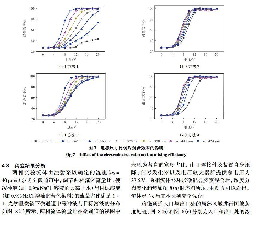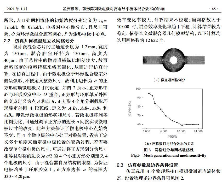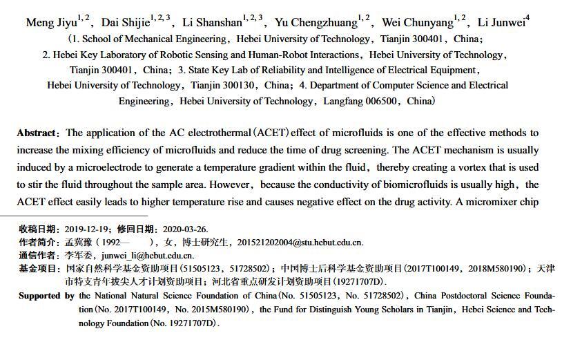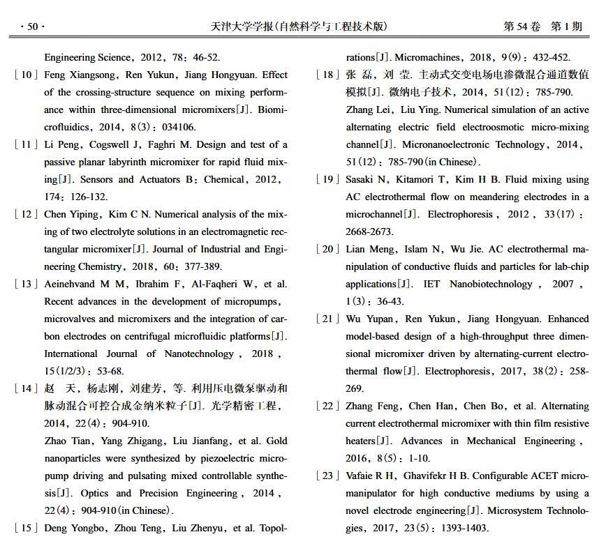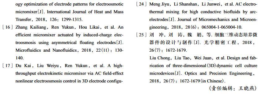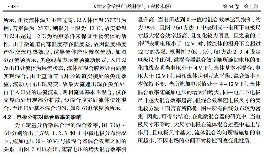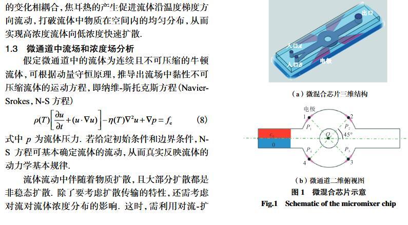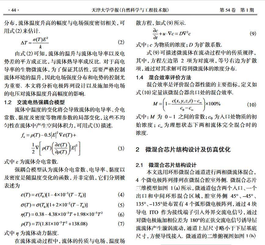 【摘要】:微流體交流電熱效應混合是縮短藥物篩選時間的有效手段之一。混合機制通常由微電極誘導流體內部產生溫度梯度,從而形成渦流用于整個樣品區域內的流體攪拌.但生物流體電導率偏高,交流電熱的溫升容易影響藥物活性。因此,設計并封裝一款環形微流體混合芯片,在不損失混合效率的前提下抑制流體的溫升,揭示該芯片的混合性能,數值模擬與實驗對微通道內兩相流體的動態混合過程進行定量分析,并對模型幾何參數、物理參數等條件進行優化研究.首先,利用Comsol仿真軟件進行電場、溫度場、流場以及稀物質傳輸場的強耦合仿真計算,以混合效率為目標函數,同時以溫升上限作為約束條件,優化電壓幅值以及微電極陣列的尺寸和分布。仿真結果表明,在給定電壓下弧形微電極陣列的分布模式以及尺寸大小是影響混合效率的主要因素,電極對稱/非對稱分布誘導不同形式的非勻強電場空間分布,電極尺寸直接影響電場對流體的作用力范圍。綜合溫升研究,仿真最優混合效率可達98.67%。然后,以優化的電極尺寸參數加工氧化煙錫微電極陣列,軟光刻加工聚二甲基硅氧烷微通道。將上述帶有特定微通道圖案的PDMS與微電極玻璃基底封裝后形成最終的微混合實驗芯片。最后,使用電導率為0.2 S/m的藍色染料溶液和去離子水緩沖液(經0.9%NaCl溶液調節電導率值)進行混合實驗,微混合器混合效率可達93.16%。