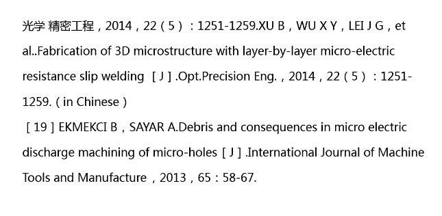 【摘要】:研究了三維微型腔模具的制備方法。該方法基于微型雙工位分層實體制造工藝(DLOM),通過多層銅箔二維微結構疊加擬合出三維隊列微電極,將制備的微電極用于微細電火花加工來制得三維微型腔模具。首先,利用線切割對100μm厚的多層銅箔進行逐層切割,獲得多層二維微結構。然后,通過真空壓力熱擴散焊對多層銅箔二維微結構進行連接,疊加擬合出三維隊列微電極。最后,在電壓80V,脈沖頻率0.2MHZ,脈沖寬度800ns,休止脈寬4 200ns的作用下,將上述工藝制備的三維隊列微電極用于微細電火花加工,獲得表面質量良好、形狀與尺寸精度較高的三維微型腔模具。為了有效減少電極損耗對加工精度的不利影響,使用隊列電極中的微電極依序對三維微型腔進行了加工。基于上述研究結果,制備了兩種形狀的三維隊列微電極并通過微細電火花加工獲得了表面粗糙度Ra為0.48μm的三維微型腔模具。與目前主流的微細電極逐層掃描放電加工三維微結構的工作方式相比,提出的三維微電極只需進行上下往返式加工便可獲得三維微型腔模具,工作效率高且損耗低。