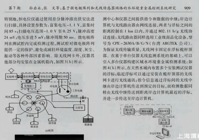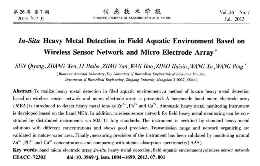 【摘要】:為對(duì)區(qū)域水環(huán)境中重金屬進(jìn)行有效檢測(cè),提出了一種基于微電極陣列和無線傳感器網(wǎng)絡(luò)的重金屬現(xiàn)場(chǎng)檢測(cè)技術(shù)。為此,提出了一種帶狀微電極陣列芯片,用于鋅、鉛、銅等三種重金屬離子的測(cè)量;基于帶狀微電極陣列芯片,開發(fā)了自動(dòng)化的水環(huán)境重金屬現(xiàn)場(chǎng)檢測(cè)儀器;多臺(tái)儀器通過802.11 b/g無線協(xié)議組成無線傳感器網(wǎng)絡(luò),對(duì)區(qū)域水環(huán)境中的重金屬含量進(jìn)行檢測(cè)。在實(shí)驗(yàn)室通過重金屬標(biāo)準(zhǔn)溶液對(duì)儀器性能進(jìn)行驗(yàn)證,表明儀器具有較好的精確度;在自然水域進(jìn)行了傳輸距離、無線組網(wǎng)測(cè)試;完成了自然水域樣品重金屬濃度檢測(cè),并同原子吸收法進(jìn)行了對(duì)比驗(yàn)證。