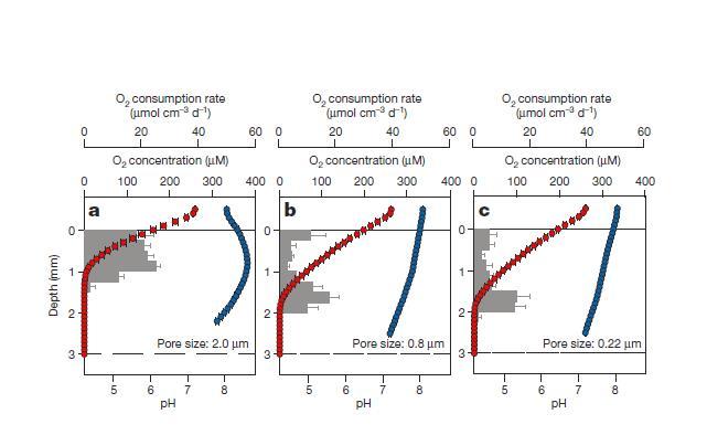 圖3:在放置不同孔徑聚碳酸酯過濾器的沉積物巖芯中培養(yǎng)20天后測得的氧氣濃度(紅色圓圈)和pH(藍色圓圈)的剖面圖