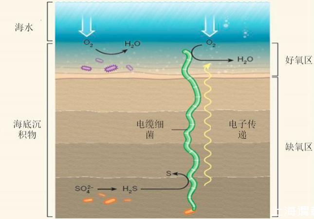 絲狀細菌在無氧-有氧層中作為電子傳輸載體(類似于電線)。在缺氧層中硫化氫失去電子被氧化成硫,電子進入硫酸鹽還原菌的絲狀菌中,向上傳輸至有氧層中,氧氣得到電子被還原成水。在電了的厘米級大范圍傳輸過程中,需要依靠絲狀硫酸鹽還原菌作為運輸工具(載體)