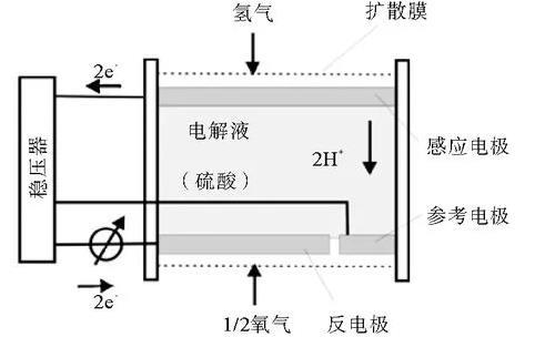 電流型氫氣傳感器在商業應用中比較常見,其通過對氫氣進行電化學反應,從而產生與氫氣濃度成正比的電流。電流型氫氣傳感器主要由3部分組成(圖1)。第一部分是發生電子轉移的電極,通常包括兩個電極——工作或感應電極和反電極。第二部分為電化學電池,包含固體或液體電解質,以允許離子在電極之間傳輸。第三部分為氣體滲透層,覆蓋了連接到感應電極的入口,并有助于限制擴散,從而使其成為決定速率的步驟。