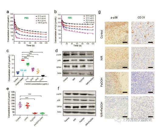 圖3、FeOOH NSs硝化H 2 S的體內(nèi)外表現(xiàn)。a,b)在不同濃度的FeOOH NSs存在下,PBS和血清溶液中溶解的硫化氫的濃度隨時(shí)間變化。兩種介質(zhì)中最初溶解的硫化氫濃度為300μmol L-1。c)CT26細(xì)胞裂解中溶解的H 2 S濃度。用不同的處理方法培養(yǎng)CT26細(xì)胞:對(duì)照組,NaHS(濃度為200μmol L-1),無(wú)或不同濃度的FeOOH NSs(n=8)。d)不同處理后CT26細(xì)胞中p-p38和p38表達(dá)水平的蛋白質(zhì)印跡結(jié)果。e)治療后腫瘤內(nèi)溶解的硫化氫水平的定量比較(n=10)。f)各種治療后腫瘤組織內(nèi)p‐p38,p38和GPX4表達(dá)水平的蛋白質(zhì)印跡結(jié)果。g)經(jīng)過(guò)一系列治療(Bar=100μm)后,對(duì)CT26腫瘤切片進(jìn)行p-p38和CD31免疫染色。