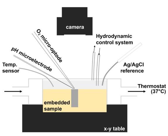 使用unisnese pH微電極和DO微光極位于樣品表面上方50μm處。其中玻璃型pH微電極(unisense)測量局部pH,其尖端長度為50μm,尖端直徑為10μm。Ag/AgCl電極適合作為外部參比電極。使用顯微操作器控制pH微電極和DO微光極之間的距離,并使用定制的雙頭級顯微操作器在水平面上保持50μm,允許原位同時監測pH值和DO濃度的演變。
