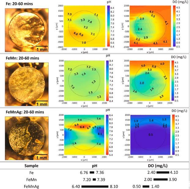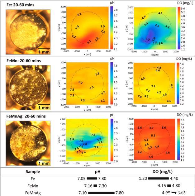 圖2、在HBSS中浸泡20-60分鐘后,Fe、FeMn和FeMnAg樣品上方的視覺外觀、局部pH值和溶解氧的分布。顯示了在HBSS中浸泡20到60分鐘的鐵基合金的視覺外觀和局部pH值和DO濃度分布。這些合金的光學圖像表明,腐蝕產物的不同積累在這些合金的表面上很明顯,并且在局部pH分布圖上顯示了明顯的酸化和堿化區域,顯示了活性陽極和陰極反應的平衡效應。