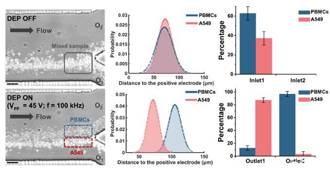 該芯片進一步用于分離各種混合樣品,充分展示了其獨特的能力和廣泛的可用性。這些樣品包括尺寸差異較明顯的MCF7癌細胞和小鼠紅細胞、尺寸相近的MCF7癌細胞和馬白細胞、尺寸基本一致的HeLa癌細胞和A549人肺癌細胞,展示出芯片具有優異的基于介電性質差異和基于尺寸差異的分離能力。特別地,在模擬血液中循環腫瘤細胞(CTCs)分離的實驗中,以尺寸相近的人體外周血單核細胞PBMCs和A549的混合樣品為例,根據兩種細胞的介電特性計算,選擇100 kHz作為工作頻率,使PBMCs受到負介電泳力,A549細胞受到正介電泳力。在實驗過程中,樣品流速保持在70微升每分鐘,圖4展示了芯片出口處在有無介電泳作用對比下的細胞流線和概率密度分布,印證了A549細胞與PBMCs連續高速分離效果,展示出巨大的臨床應用潛能。