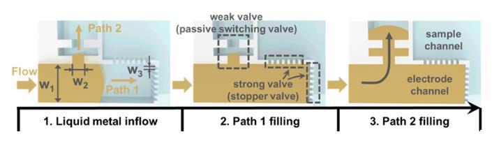 本工作利用毛細閥(CBVs)提供的強大被動流體控制能力實現液態金屬厚電極自組裝(圖2)。電極通道通過具有高閾值壓強的小孔與樣品通道連接,小孔作為截止閥防止液態金屬進入樣品通道。此外,每組電極行和列的交叉點處放置了中等閾值壓強的毛細閥結構,充當被動切換閥,能在液態金屬流動時自動改變路徑。根據所設計的結構,當液態金屬注入電極通道時會按照預設路徑自動填充滿電極通道,形成緊湊的大陣列液態金屬厚電極。由于每組電極在液態金屬填充過程中具有相同的結構和工作條件,因此電極數量可以無限擴展。