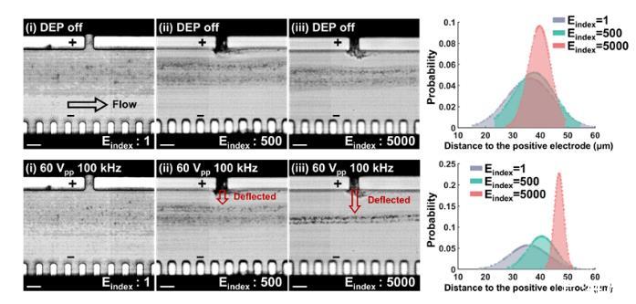 實驗證明,這種方法可以在拇指大小的空間中集成5000對液態金屬厚電極。在100微升每分鐘的高流速下,該芯片對流過5000對電極的PS微球產生顯著的介電泳累積作用(偏轉40微米),通量是同類技術的10倍;并具備基于粒子介電性質差異與尺寸差異的高通量分離能力,突破了介電泳對于尺寸相近的粒子樣本難以分離的局限。