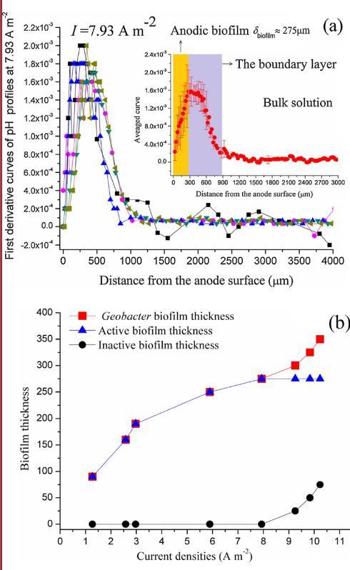 圖3、在7.93A m-2下pH對(duì)深度的一階導(dǎo)數(shù)圖,插圖顯示了平均曲線,誤差線表示標(biāo)準(zhǔn)偏差。(a);各種電流密度下的生物膜厚度及其活性部分和非活性部分(b)。