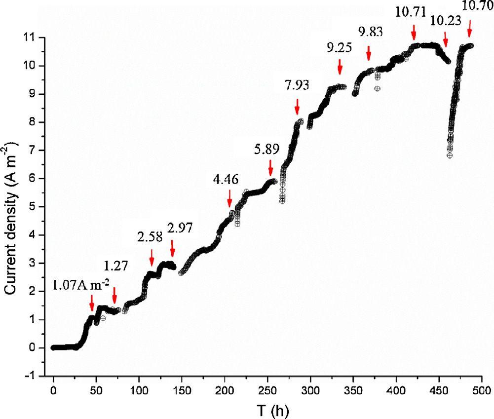圖1、在恒定施加電位(-0.1 V vs.Ag/AgCl)下的Geobacter生物膜生長(zhǎng)情況。紅色箭頭表示用于pH和CV測(cè)量的各種電流密度(它們分別為1.07Am2,1.27Am2,2.58Am2,2.97Am2,4.46Am2,5.89Am2,7.93Am2,9.25Am2,9.83Am2,10.71Am2,10.23Am2和10.70Am2,分別為45小時(shí),72小時(shí),116小時(shí),140小時(shí),205小時(shí),256小時(shí),285小時(shí),330小時(shí),418小時(shí),440小時(shí),455小時(shí)和482小時(shí))。