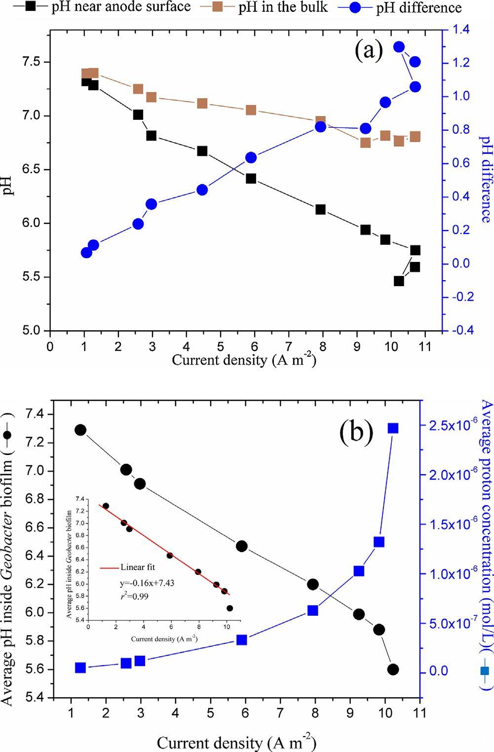 圖4、陽(yáng)極表面附近和批量溶液中的pH變化以及作為電流密度函數(shù)的pH差異(a)。Geobacter生物膜內(nèi)平均pH變化曲線及各種電流密度下相應(yīng)的質(zhì)子濃度曲線,插圖顯示了電流密度和平均pH值之間的線性相關(guān)性(r2=0.99)(b)。
