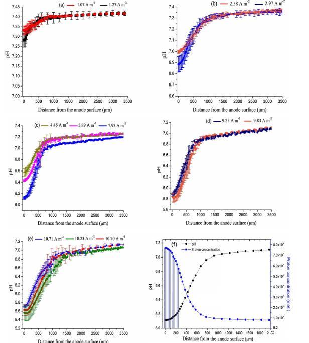圖2、在電流密度為1.07A m-2和1.27A m-2時(shí)Geobacter生物膜內(nèi)的平均pH分布,邊界層和批量溶液(a);在2.58 A m-2和2.97A m-2時(shí)(b);在4.46A m-2,5.89 A m-2和7.93A m-2時(shí)(c);在9.25A m-2和9.83 A m-2時(shí)(d);在10.71A m-2,10.23A m-2和10.70A m-2時(shí)。誤差線表示標(biāo)準(zhǔn)偏差。圖2(f)是在7.93A m-2下測(cè)量的剖面之一,以及Geobacter生物膜內(nèi)上方和內(nèi)部的質(zhì)子濃度剖面。
