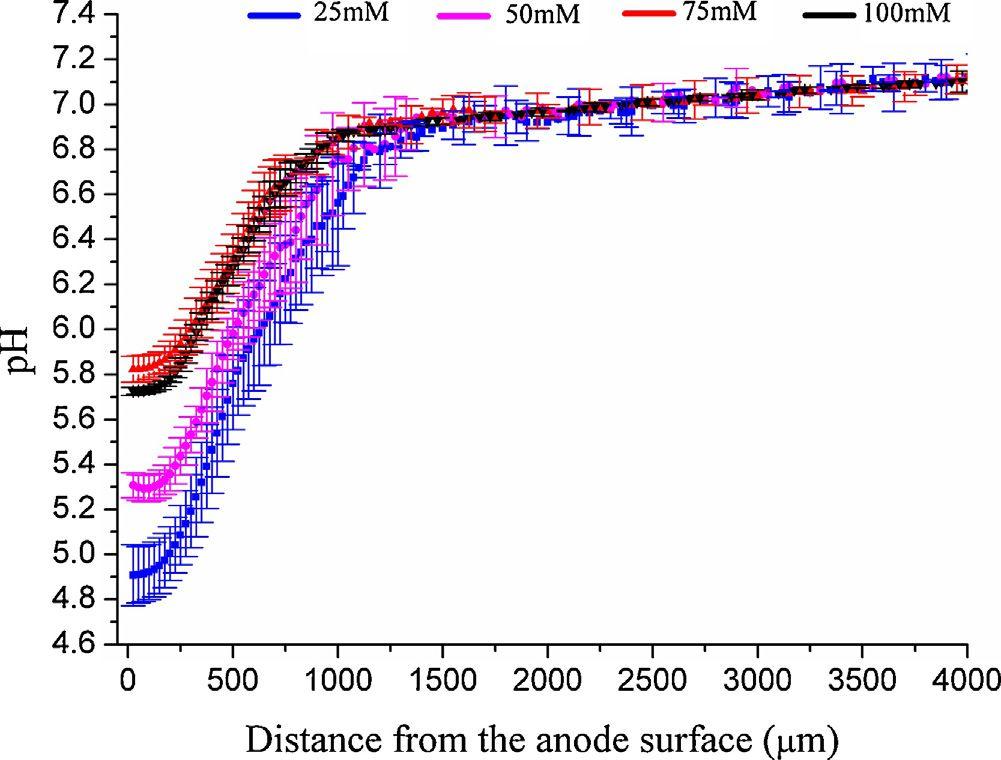 圖5、緩沖濃度(25 mM、50 mM、75 mM和100 mM)對(duì)Geobacter生物膜內(nèi)pH分布的影響。誤差線表示標(biāo)準(zhǔn)偏差。