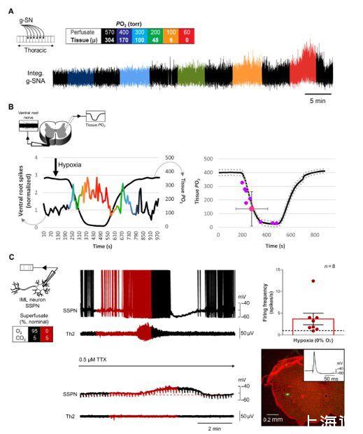 圖2、新生兒在原位灌注的胸脊髓和整塊橫向胸脊髓切片制劑中對(duì)缺氧的交感神經(jīng)反應(yīng)。(A)記錄新生兒(P2)g-SNA在單次灌注胸脊髓原位制備中對(duì)缺氧的反應(yīng)(左上角示意圖)。減少灌注液PO2會(huì)增加g-SN活性。方框:顏色編碼說明了以托為單位的灌注液P O 2。曲線下的幅度和/或面積表示活動(dòng)水平。(B)使用Clark型微電極的IML組織P O 2測(cè)量,尖端低于組織表面100μm,對(duì)側(cè)腹神經(jīng)記錄來自整塊橫向胸脊髓切片制備(左上角示意圖)。作為組織PO2在14種制劑中的8種中,腹神經(jīng)活動(dòng)減少,腹神經(jīng)活動(dòng)增加。P O 2閾值響應(yīng)(如上定義)發(fā)生在140±121托(n=8)。(C)整體制劑中的單個(gè)IML SSPN(全細(xì)胞)和腹根神經(jīng)活動(dòng)(T2)。在1分鐘的峰值響應(yīng)期間,發(fā)射率增加了3.67±1.32峰值/秒(n=8)。在TTX中,缺氧使神經(jīng)元去極化3.1±0.98 mV(重復(fù)測(cè)量單向ANOVA;基線與缺氧,P=0.03;缺氧與沖洗,P=0.01;n=10)但對(duì)膜電阻沒有影響(1049±29兆歐;重復(fù)測(cè)量單向方差分析,P=0.5;n=10)。