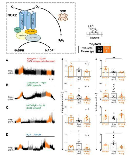 圖4、NOX和ROS在SOS中的作用。方框顏色編碼說明了以torr為單位的灌注液PO2。左:大鼠原位胸脊髓制劑中g(shù)-SNA對(duì)缺氧的反應(yīng)(見示意圖)。在1分鐘間隔內(nèi)測(cè)量低氧反應(yīng)(灌注液和組織PO2,分別為100和~6 torr)和藥物效應(yīng),分別以橙色和灰色表示。右:分組數(shù)據(jù)。A夾竹桃麻素、NOX抑制劑;(B)釓、NOX激動(dòng)劑;(C)MnTMPyP,SOD模擬物;(D)H2O2,活性氧。