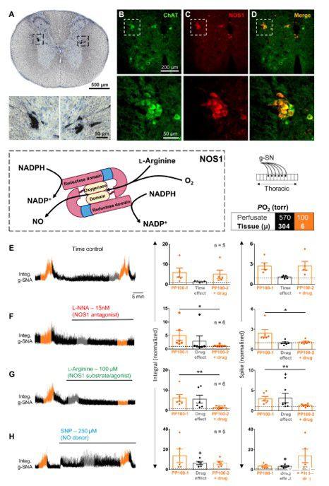 圖3、NOS1在SOS中的作用。(A)大鼠胸脊髓IML中NOS1的過氧化物酶免疫組化。(B和C)小鼠胸脊髓中NOS1(紅色)和ChAT(綠色)的雙熒光免疫組化。(D)合并NOS1和聊天標(biāo)記。IML(虛線方塊)在底部面板中被放大。(E到H)框:顏色編碼說明灌注液的PO2。左:大鼠原位胸脊髓制劑中g(shù)-SNA對(duì)缺氧的反應(yīng)(見示意圖)。在1分鐘間隔內(nèi)測(cè)量低氧反應(yīng)(灌注液和組織PO 2,分別為100和~6 torr)和藥物效應(yīng),反應(yīng)最大,分別以橙色和灰色表示。右:分組數(shù)據(jù)。(F)L-NNA、NOS1阻斷劑;(G)L-精氨酸,NOS1激動(dòng)劑;(H)SNP,不依賴NOS的NO供體。