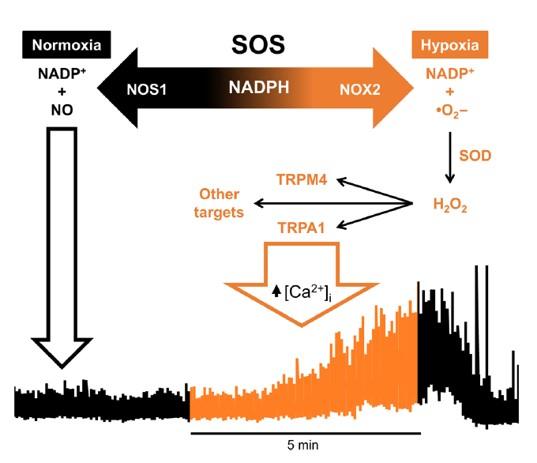 圖5、SOS氧傳感機(jī)制模型。兩種酶NOS1(神經(jīng)元NOS)和NOX2競(jìng)爭(zhēng)共同底物NADPH。NOS1在IML中非常豐富,并作為PO2依賴的NADPH。當(dāng)PO2下降時(shí),NADPH可用性增加,增加NOX2活性并產(chǎn)生超氧化物(·O2)和H2O2。ROS激活包括TRPA1和TRPM4在內(nèi)的多種受體,增加細(xì)胞內(nèi)鈣和SSPN活性。該模型意味著需要剩余量的氧氣來維持NOX產(chǎn)生ROS和SOS響應(yīng);即使組織P O 2為零保持,SOS失敗。