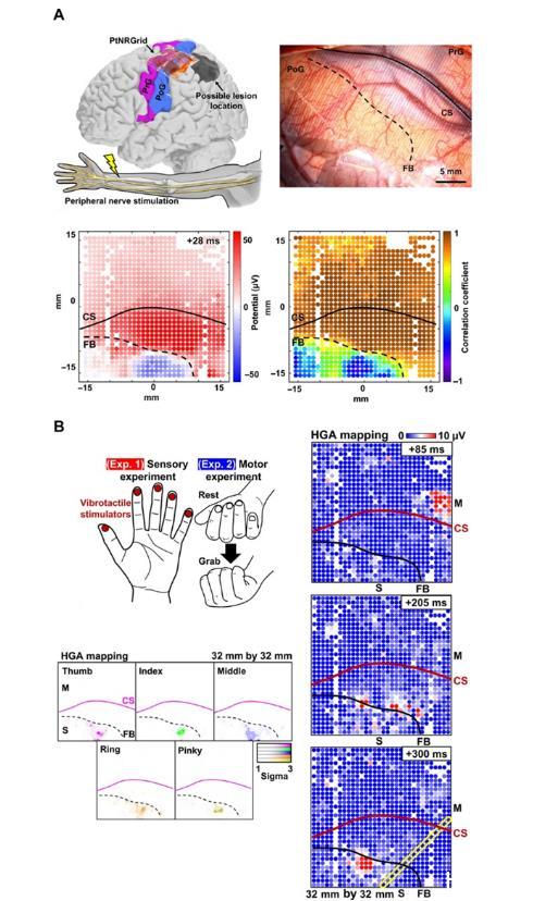 圖4:PtNR微電極網(wǎng)格放置與中央溝與相位反轉(zhuǎn)識別的M1-S1功能邊界的差異顯示(A)。右上、左、右面板分別顯示網(wǎng)格放置和識別的功能邊界(FB)相對于中央溝(CS)的位置。底部面板顯示了FB與CS的關(guān)系,這是通過基于潛力的圖(左)和相關(guān)系數(shù)圖(右)確定的。感覺和運(yùn)動實驗范式示意圖及相關(guān)結(jié)果(B)。左下角的五組圖顯示了每個指尖在振動觸覺刺激下HGA的定位和強(qiáng)度。右側(cè)垂直的三個窗格顯示了手握開始后85ms,205ms和300ms時HGA在初級運(yùn)動和感覺皮質(zhì)區(qū)域的進(jìn)展情況。經(jīng)Tchoe et al.2022.7許可改編。