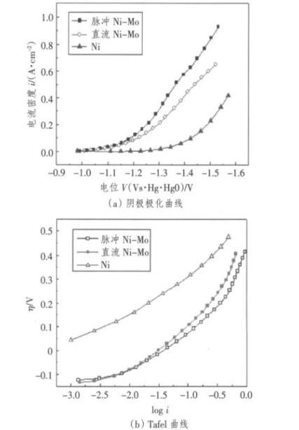 采用三電極系統動電位掃描測定電極的陰極極化曲線。電解液為30%(wt)的氫氧化鉀溶液,掃描速度10 Vs-1。分別以脈沖電沉積和直流電沉積制備的Ni-Mo合金電極為工作電極,輔助電極采用大面積鉑網,自制Hg/HgO電極為參比電極。所用的測試儀器為美國EG/G公司生產的M273電化學工作站。