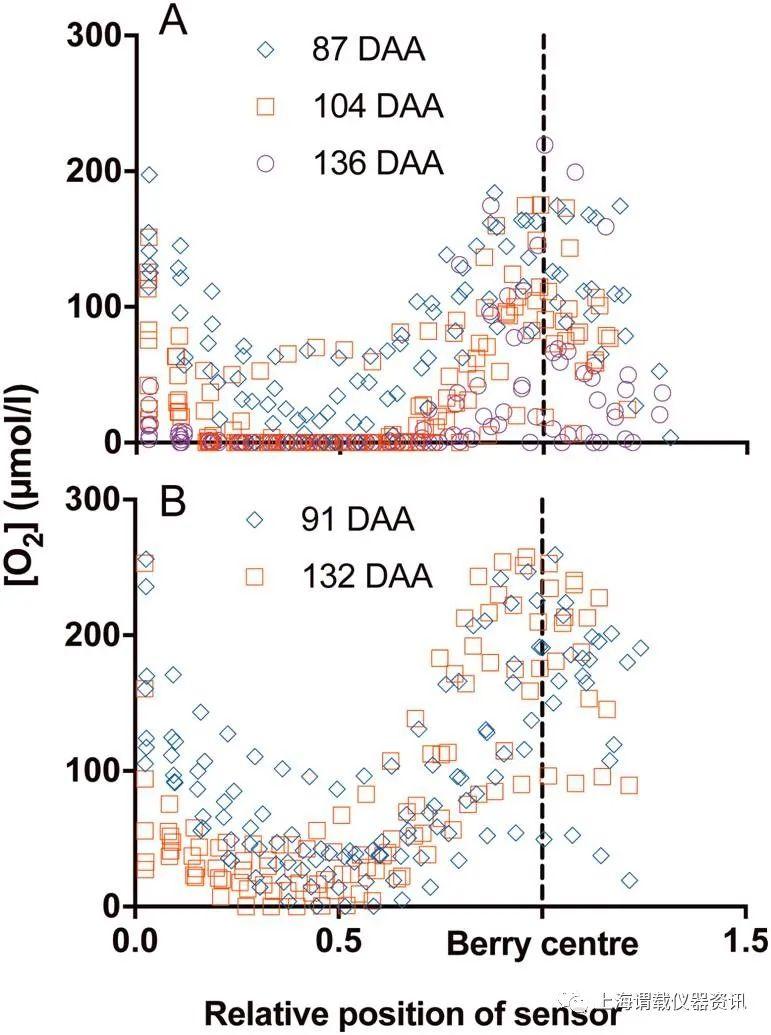 圖3、單個漿果半徑范圍內的氧濃度的分布。圖A表示的是2015-2016年采集的87天、104天和136天生長的霞多麗品種葡萄漿果內的氧濃度剖面。圖B表示的是2015-2016年采集的91天、132天生長的紅寶石品種的無籽的葡萄漿果內的氧濃度剖面。