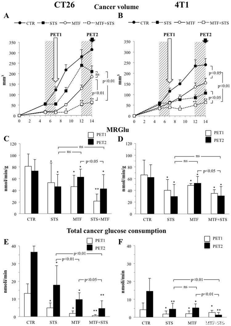 圖1、二甲雙胍藥物療法和饑餓療法對(duì)于腫瘤細(xì)胞的生長(zhǎng)及其葡萄糖能量代謝的影響。圖A,B表示的是老鼠體內(nèi)注入CT26癌細(xì)胞和4T1細(xì)胞后進(jìn)行喂養(yǎng)14天,通過(guò)使用不同的治療方法判斷老鼠體內(nèi)腫瘤體積大小的變化情況。圖C、D表示的是采用18F-FDGPET掃描法測(cè)試?yán)鲜篌w內(nèi)腫瘤細(xì)胞的消耗葡萄糖代謝率水平的大小。圖E、F表示的是老鼠體內(nèi)癌細(xì)胞葡萄糖消耗總量水平的大小。從圖A、B中可以看出,當(dāng)通過(guò)使用能量代謝干擾法和饑餓療法時(shí),老鼠體內(nèi)腫瘤體積增長(zhǎng)較慢,對(duì)于腫瘤的生長(zhǎng)抑制更好。圖C、D反映的是腫瘤細(xì)胞葡萄糖代謝率的水平,當(dāng)使用二甲雙胍藥物療法和饑餓療法時(shí),腫瘤細(xì)胞的葡萄糖代謝率有所降低。圖E、F也進(jìn)一步證明了該結(jié)論,即使用了STS、MTF療法后,腫瘤細(xì)胞消耗葡萄糖的量也減少了。