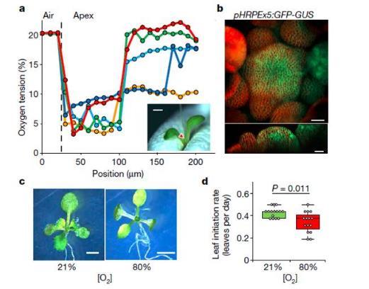 圖1、植物的莖尖分生組織(SAM)活性的保持需要一個低氧生態區域。圖a表示的是通過微電極沿植物莖尖組織的頂頭方向測試SAM區域的氧濃度變化,圖中的顏色代表的是單次測試。圖b表示的是擬南芥花序分生組織中GFP的表達受缺氧反應啟動子(pHRPE)的驅動。圖c表示的是在常規氧條件下和高氧條件下生長的植物的表現。圖d表示的是在常氧和高氧條件下生長的擬南芥葉片起始速率.