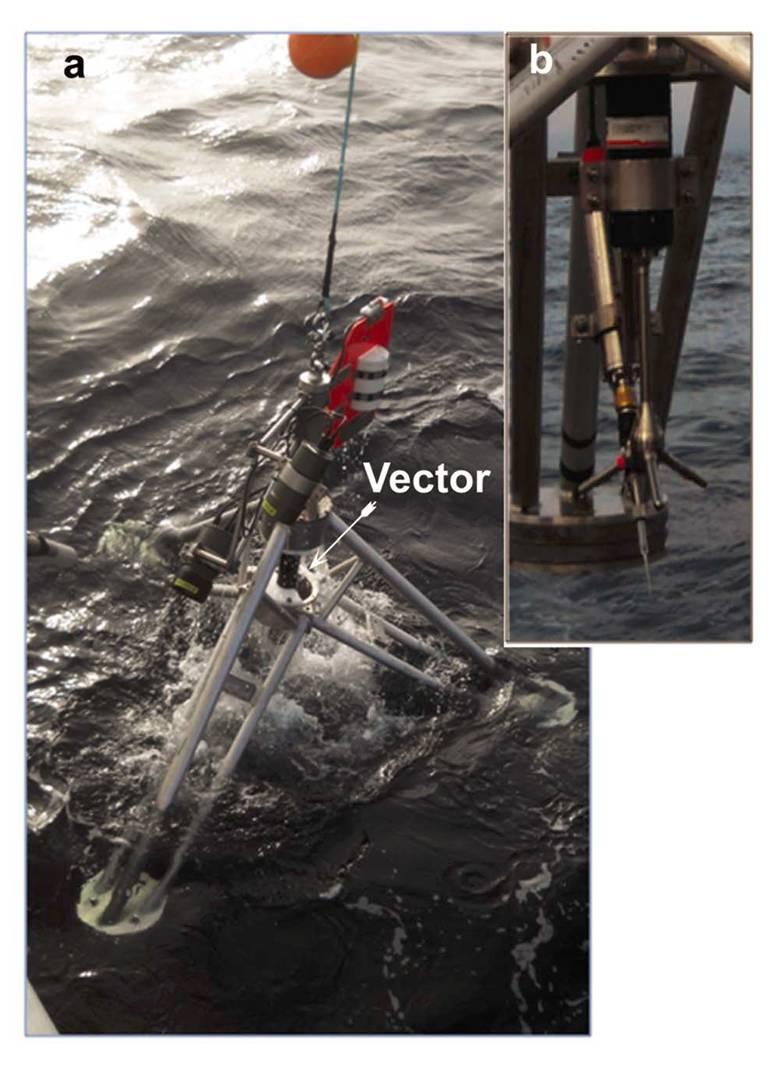 圖1、BOXER著陸器及渦動系統在部署海洋底部測試期間的照片和(b)用O2微電極和放大器定位的測試探頭的放大圖。