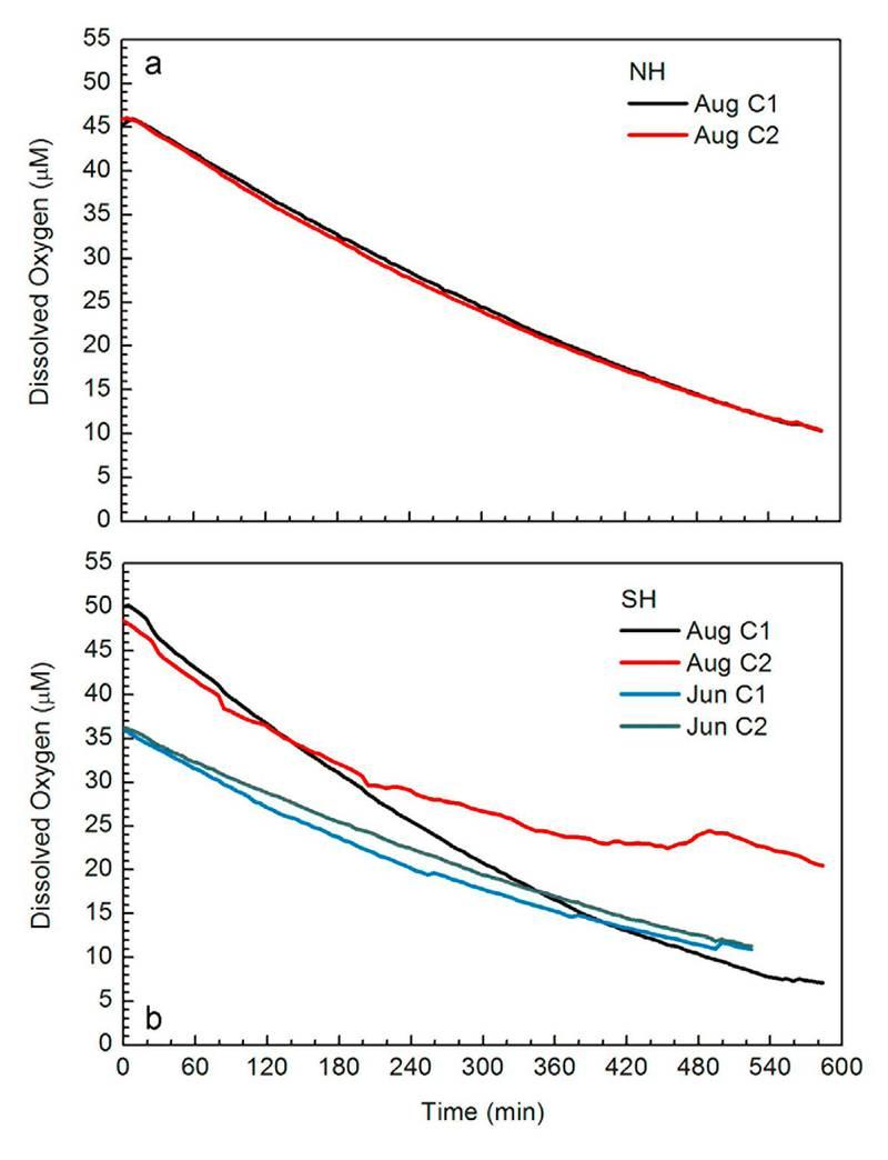 圖4、測試的俄勒岡州大陸架的NH和SH區域的底棲生物艙內溶解氧濃度隨時間的變化情況。C1:艙室1;C2,艙室2。氧氣測試設備通過安裝在艙蓋上。這些記錄開始于艙室關閉時,即部署設備后的3-5小時。艙室室通量是由線性擬合的氧氣消耗獲得的。(180分鐘后氧氣消耗的數據)