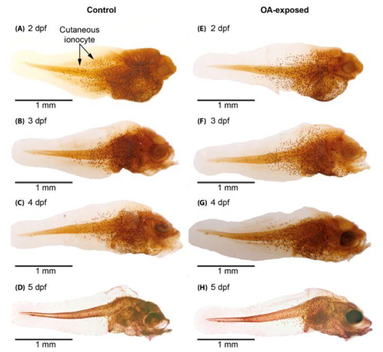 探討了海洋酸化(OA)對白鱸(Atractoscion nobilis)幼體生長和離子調節能力的影響。研究中使用控制條件(pCO2為542±28μatm)和升高條件(pCO2為1831±105μatm)分別培育了白鱸的卵和幼體,持續至受精后五天。通過Na+/K+-ATPase(NKA)酶的免疫檢測確定了皮膚離子細胞。與控制組相比,暴露于升高pCO2的幼魚具有顯著更多的皮膚離子細胞數量和密度。然而考慮到離子細胞的大小時,相對離子細胞面積(作為總離子調節能力的代理)沒有改變。同樣在5 dpf時,控制組和實驗組幼魚的相對NKA含量、靜息氧氣消耗率和總長度之間沒有差異,也沒有在2至5 dpf期間相對離子細胞面積和總長度變化的速率方面的差異。