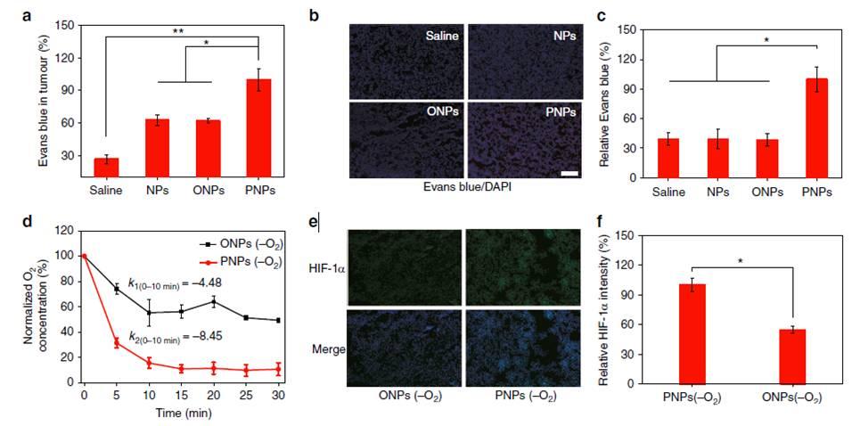 圖2、體內缺氧PNPs介導的滲透性增強和缺氧的長期效應。圖a)腫瘤中埃文斯藍積累的分析,24小時后靜脈注射脫氧PNPs。用紫外-可見分光光度法(UV-vis)測定腫瘤中埃文斯藍的含量。圖b)體外熒光圖像的伊文思藍(紅色)和4‘,6-二脒基-2-苯基吲哚(DAPI)(藍色)染色(圖中的比例尺存是100μm)。圖c)定量Evans藍在b中的累積量。圖d腫瘤內注射脫氧PNPs和油納米顆粒后溶氧(DO)的變化。圖e)腫瘤內注射缺氧PNPs和ONPs(比例尺寸,100μm)24小時后體現的免疫熒光圖像的低氧factor-1α(HIF-1α)(綠色)染色部分。(f)量化HIF-1α表達數。