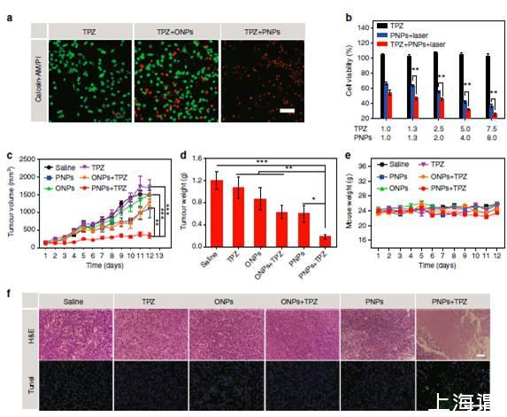 圖4、PNPs增強TPZ化療法。用TPZ和油納米粒子(ONPs)或PNPs粒子在激光下培養CT26細胞的熒光圖像,激光輻射(808 nm,400mWcm-2)。活細胞用Calcein-AM染色(綠色),死亡/晚期凋亡細胞用碘化丙鈉染色(π)(紅色),(比例尺寸,100μm)。圖b)治療組細胞存活率。圖c)治療組小鼠腫瘤生長曲線(n≥6/組)。PNPs和TPZ都是第1、3和5天分別靜脈注射到小鼠體內。圖d)腫瘤重量在第12天歸一化平均。圖e)動物體重的變化。圖f)蘇木精和伊紅(H&E)(比例尺寸、100μm)和末端轉移酶的dUTP缺口末端標記(TUNEL)(綠色)(比例尺寸、規模100μm)CT26腫瘤染色。試樣的樣品都是在第8天收集不同組別的樣本.