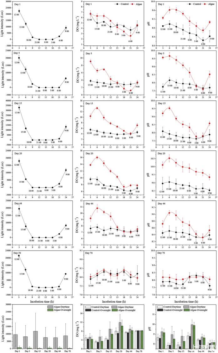 圖2、在一個完整的一晝夜的循環周期中,控制池和藻類處理池的水柱樣品中光強度、DO和pH值的變化情況。白天和夜間的所處的時間段分別指的是從早上6點到下午18點,從下午18點到早上6點。分別給出這些時間段測試出的光強度、DO和pH值(所有的測試值為三次重復測量的平均值)