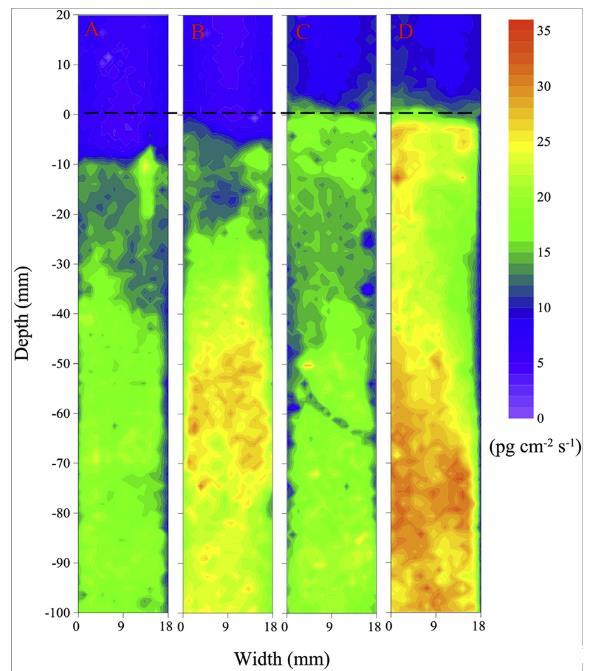 圖5、應用DGT法對進行對比組水體和沉積物和藻類處理的水體和沉積物測試獲得的不穩定S(-II)濃度的二維分布圖。圖A和B分別)分別在第44天、日間及夜間時間段對應的對比組水體和沉積物和藻類處理的水體和沉積物中的不穩定的S(-II)濃度;圖C和D分別表示的是在第44天時藻類處理沉積物中白天和晚上的不穩定的S(-II)濃度。