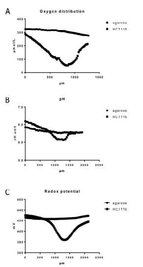 圖2、應用微電極對瓊脂糖包埋的HCT116細胞純瓊脂糖培養基測試的一些物理化學性質參數,其中圖A測試的是氧氣的分布情況(測量步徑為20um),圖B測試的是pH(測量步徑為40um),圖C測試的是氧化還原電位(測量步徑為40um)。從圖中可以看出,瓊脂糖包埋的HCT116細胞體內的氧氣濃度、pH、氧化還原電位是呈現逐漸降低然后在慢慢增加。并且表現為在球體中央區域內的氧氣濃度、pH、氧化電位值最低。