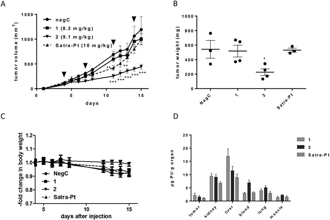 圖5、圖A表示的是在老鼠活體內注入克分子數計量四價鉑類化合物1、2、賽特鉑化合物后,對于老鼠HT1080皮下細胞腫瘤在0-15天時間段內,腫瘤體積或重量的變化情況。圖B表示的是老鼠HT1080皮下皮下細胞腫瘤對于不同四價鉑類復合物的在第十五天時的腫瘤的重量情況。圖C表示的是實驗老鼠注入了不同的四價鉑復合物后,老鼠在0-15的時間段老鼠的重量變化情況。圖D表示的是使用了ICP-MS分析老鼠不同器官組織體內的鉑的含量。
