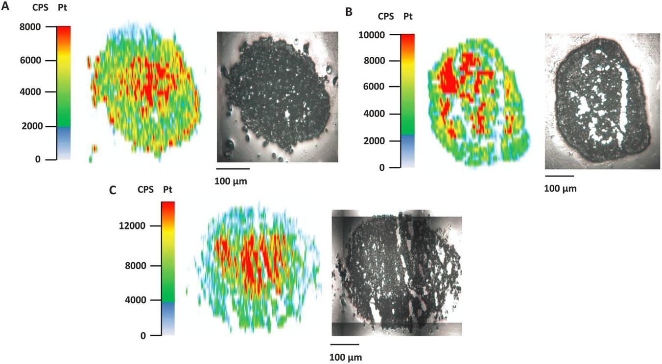 圖4、HT1080細胞經過四價鉑配合物(1、2)處理后,包封瓊脂球體內的鉑的濃度分布情況。其中圖A表的是經過四價鉑配合物1處理后的HT1080細胞內的鉑含量分布,圖B表示的是經過四價鉑配合物1處理后的HT1080細胞內的鉑含量分布,圖C表示的是使用賽特鉑處理后的細胞內的鉑含量分布。其中激光I燒蝕CP-MS測試的是使用了20um厚的冰凍切片樣品。