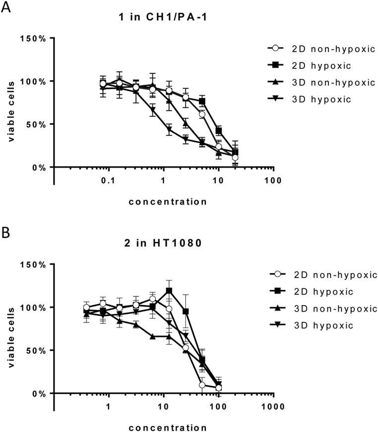 圖3、四價鉑復合物1、2在缺氧和非缺氧狀態下的細胞毒性實驗。其中圖A表示的不同濃度抗腫瘤藥物四價鉑復合物1加入后,在是缺氧和非缺氧狀態下CH1/PA-1活細胞濃度變化曲線,圖B表示的是不同濃度抗腫瘤藥物四價鉑復合物1加入后,在缺氧和非缺氧狀態下的HT1080活細胞濃度變化情況。從圖中的趨勢可以看出,隨著四價鉑復合物的濃度增加,活細胞數逐漸降低,并且在低氧濃度下,同意當量的鉑復合物的加入導致的活細胞數量下降的更快。